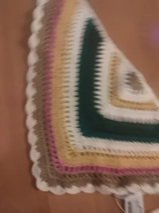 Bandana de crochet con un diseño colorido y un borde festoneado. - Tejido a mano. - Tiras para atar en la nuca y cuello.