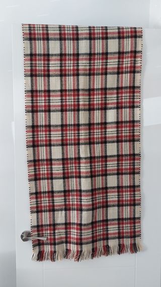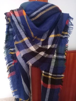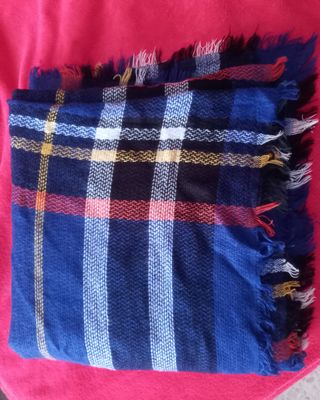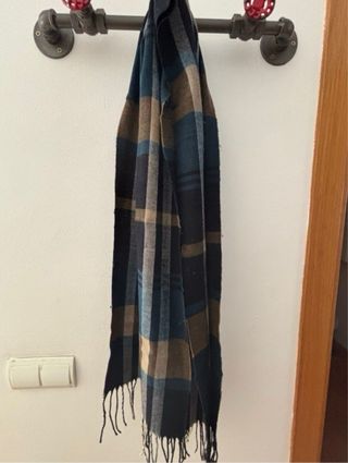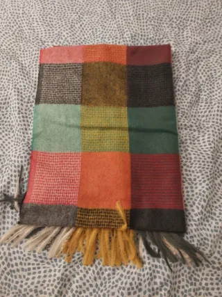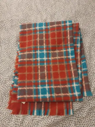 Bufanda con un diseño a cuadros en tonos rojos, azules y marrones. Perfecta para añadir un toque de color a tu atuendo. - Diseño a cuadros. - Flecos en los extremos.