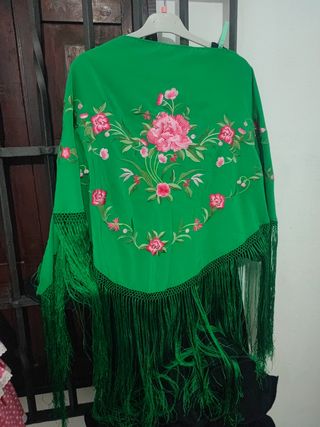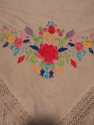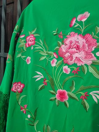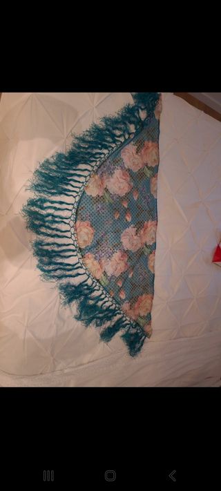 Manton de plumeti en tono turquesa y con flores dibujadas. Marca Micaela Villa. Puesto en una ocasion. Con flecos enrejados