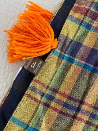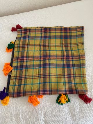 Nuevo. Sin estrenar. Pañuelo cuadrado de cuadros en amarillo con borlones en los filos.