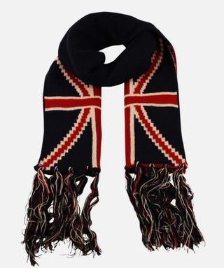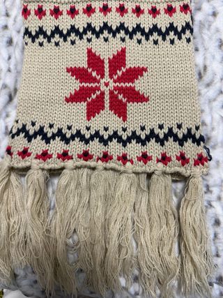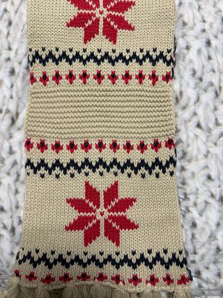 Bufanda tejida larga con un diseño nórdico. - Tejido de punto grueso. - Motivos de estrella en rojo. - Bordes con flecos.