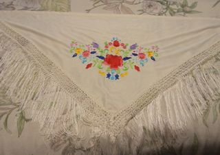 Preciosa pieza de mantón de Manila. Es de color turquesa con un bordado blanco. - Flecos largos - Tela ligera y delicada - Ideal para eventos especiales