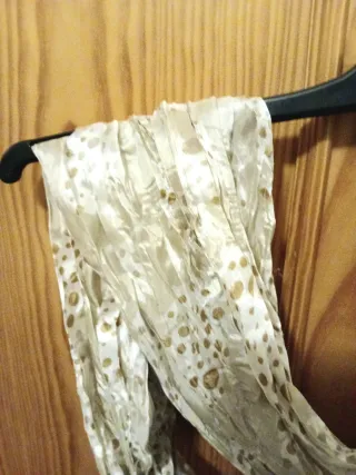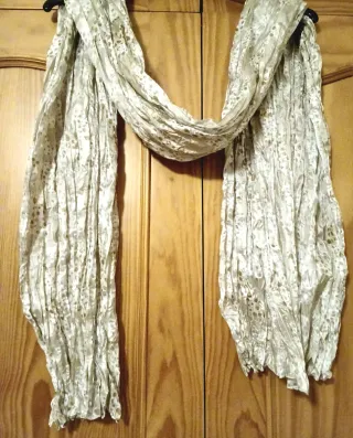 Chal con un toque de brillo, ideal para realzar cualquier atuendo. - Tonos cremas y dorados. - Diseño con textura plisada. - Estampado sutil. - Juvenil, ligero. En mi perfil mas cosas por si deseas pasarte. Puedo hacer envíos. Preferentes por Inpost , si puede ser y solo por Wallapop.