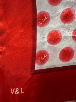 Pañuelo de cuello de la marca Victorio y Lucchino. - Diseño con lunares rojos sobre fondo blanco. - Detalle del logo V&L en varios puntos. - Borde liso en color rojo.
