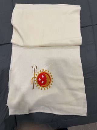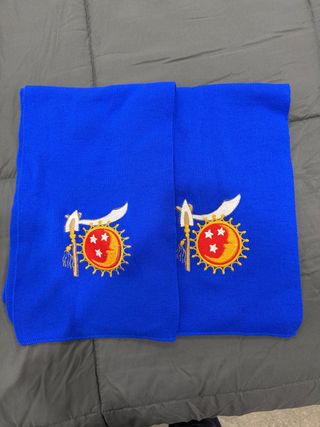 Dos bufandas de lana con un diseño bordado. - Diseño de los Moros Realistas de Elda. - Colores: azul y multicolor.