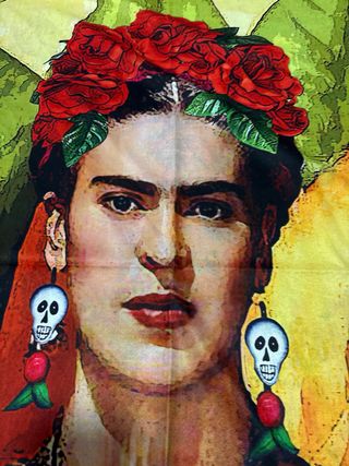 Bufanda con un vibrante diseño inspirado en Frida Kahlo. Es un accesorio llamativo y único. - Diseño multicolor con detalles en rojo. - Nueva a estrenar.