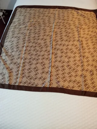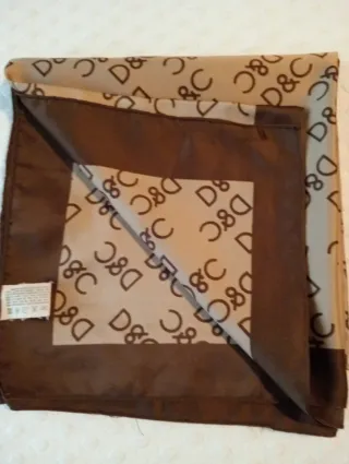 Pañoleta con estampado repetido de las iniciales D&C. Made en Italia 100% Polyester Medidas 88x88cm - Diseño con borde marrón. - Tejido ligero.
