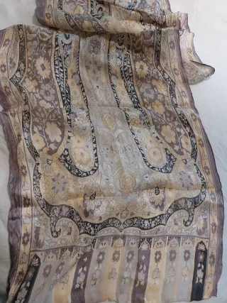 Elegante foulard de color beige con delicados bordados florales. - Tejido ligero y vaporoso. - Diseño con motivos florales. - Borde decorado con puntilla.