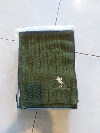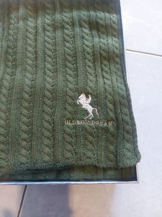 Bufanda de punto con un diseño trenzado clásico. Presenta un bordado de un caballo y el texto OLD BOSS DREAM. - Tejido suave y cálido. - Color verde intenso.