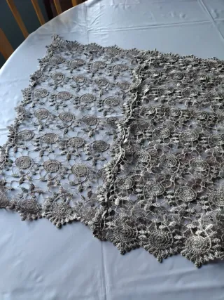 Precioso chal con un diseño intrincado y elegante. - Tejido con detalles en dorado y plateado. - Acabado con un borde festoneado.