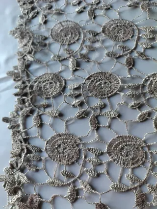 Mide 160 cms de largo y 55 cms de ancho. Los flecos unos 14 cms. Color gris azulado.