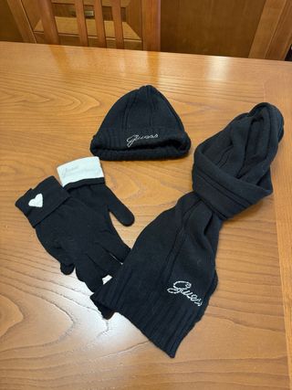 Conjunto de invierno de la marca Guess, ideal para mantenerte abrigado con estilo. - Gorro de punto negro con detalle de logo. - Bufanda a juego con diseño de punto y logo. - Guantes negros con puño blanco y detalle de corazón. - los guantes que yo utilizo la talla pequeña me quedan algo grandes