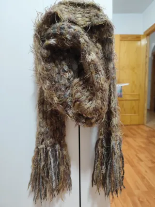 Bufanda tejida con un diseño de hilos sueltos y flecos. - Material suave y cálido. - Tonos marrones y beige. - Ideal para complementar atuendos de invierno.