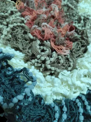 Cuatro bufandas de punto con diseños de volantes únicos. 1'25 m. Cada una de largo.Colores diferentes; * Marfil. * Gris claro y oscuro. * Beige claro y oscuro. * Rosa, marrón y coral. - Hechas a mano con cuidado. - Textura suave y ligera. - Abrigaditas y estilosas para el invierno