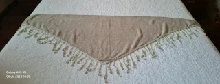Chal de lana suave con un diseño triangular y adornos de flecos en los bordes. Se puede poner con el pico hacia atrás o hacia delante. Queda ideal y combina muy bien. Es del corte inglés, otro la etiqueta la corte en su momento. - Material: Lana - Color: Beige - Adorno: Flecos - medida del pico 50cms - medida de lado a lado 160cms