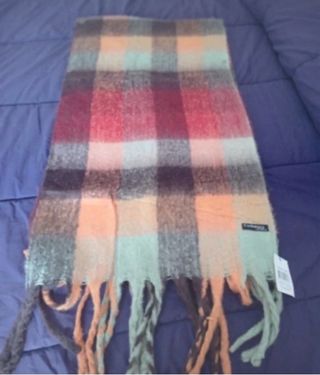 Bufanda de lana con un diseño de cuadros clásico. Es suave y cálida, perfecta para los días fríos. - Diseño a cuadros en tonos rosas, azules y burdeos. - Flecos en los extremos.
