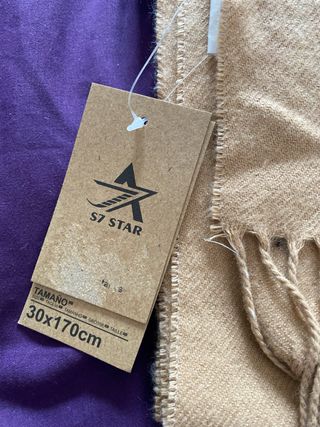 Bufanda de color camel con flecos en los extremos. Es suave al tacto y perfecta para complementar tu atuendo. - Medidas: 30x170cm.