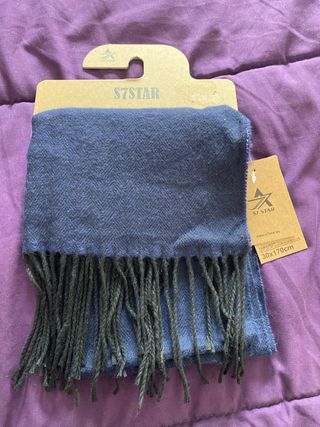 Bufanda de S7STAR con un diseño elegante y moderno. - Color azul marino con detalles en gris. - Tejido con patrón de espiga. - Flecos en los extremos.