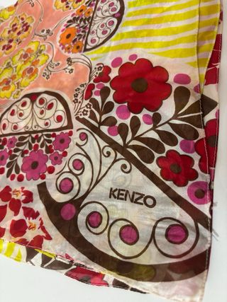 Pañuelo muy ligero de la marca Kenzo, estampado, colorimetria primavera. Se envía en su sobre original de la marca súper bonito para que lo guardes. (ojo: el embalaje tiene dentro una pestaña dañada por dentro, no se nota por fuera)