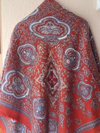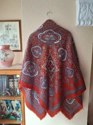 Precioso pañuelo o mantón con un diseño tradicional, ideal para trajes regionales. -Lanilla, muy suave Grande, cuadrado 132x132cm Con poquisimo uso Muy favorecedor Para traje regional o el uso que quieras - Diseño paisley y floral. - Bordes con flecos. No negocio