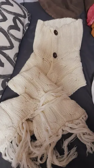 Bufanda tejida a mano con un diseño de punto grueso y flecos en los extremos. Su tono neutro la hace muy versátil. - Material: Lana. - Color: Beige. - Diseño: Punto grueso con flecos.