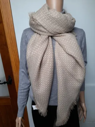 Bufanda grande a estrenar de Natura. Medidas: 145cm x 145cm Su diseño presenta un patrón de rombos en relieve y flecos en los extremos. Tejido y tacto muy suave y delicado Para combinar con todos los loock - Tejido suave y cálido. - Diseño texturizado. - Flecos decorativos.