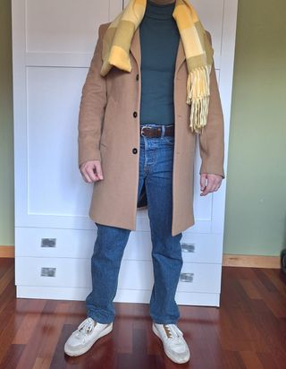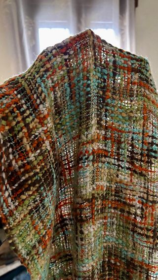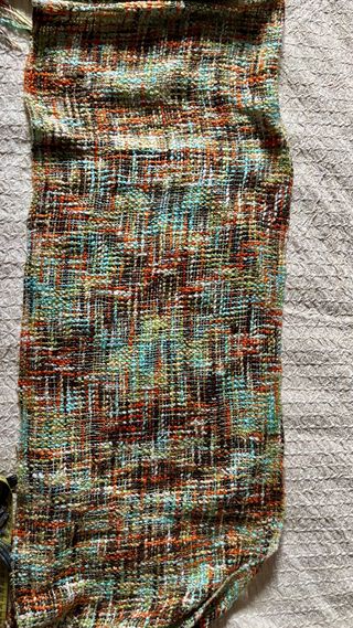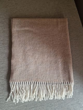 Bufanda de mujer tejida con lana gruesa de mezcla con tonalidades anaranjadas y marrones. Grupos de flecos anudados en los extremos (24cm de longitud aproximada). Composición 70% Acrílico y 30% Lana. Adquirida en El Corte Inglés. Longitud aproximada (sin contar flecos) 196 cm. Anchura aproximada 22 cm. Muy poco uso.