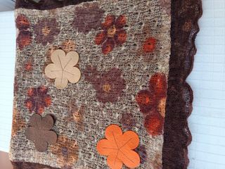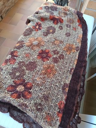 pañuelo ganchillo medidas 184cm y terminado con un volante y con flores sobrepuestas en un lateral y bufanda naranja muy suave medidas 1'65 cm más 10cm los flecos