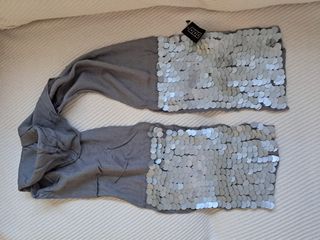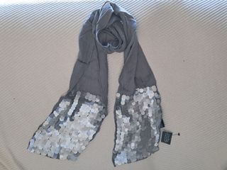 Bufanda gris con detalles de lentejuelas plateadas. Perfecta para dar un toque de brillo a cualquier look. Sin estrenar. Conserva la etiqueta original. Medidas: 18 x 138 cm.