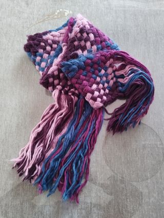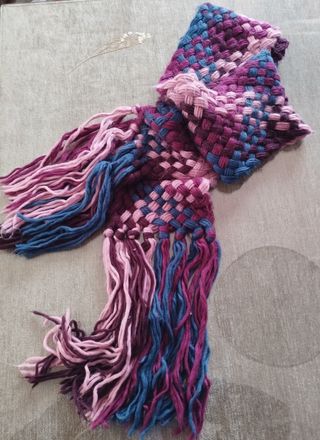Bufanda para mujer con tejido trenzado en colores rosa palo, verde oscuro y granate. Grupos de flecos, en los mismos colores, anudados en los extremos (de longitud aproximada 28 cm). Medidas aproximadas: Longitud : 206 cm; Anchura: 16cm Poco uso. La lana está un poco deshilachada, más por el tipo de lana que por el uso (última imagen), ya que se ha utilizado muy poco.