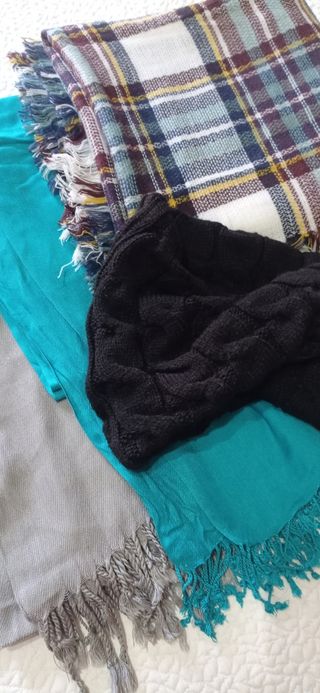 Dos bufandas finas sin estrenar, cuello de lana negro, pañoleta de cuadros,