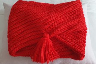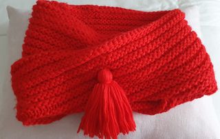 Cuello de lana en punto medio, con un cruzado delantero y una borla decorativa. Muy bonito, en color rojo vivo.