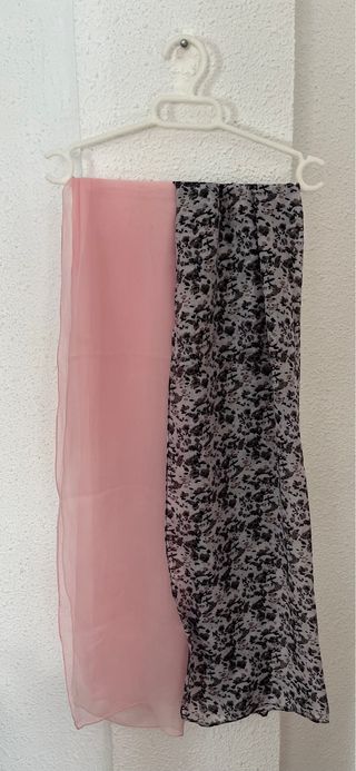 Conjunto de dos pañuelos, uno liso y otro estampado. - Pañuelo liso en tono rosa. - Pañuelo con estampado abstracto en tonos grises y marrones.