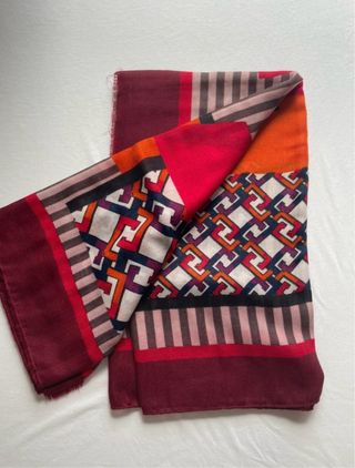 Pañuelo con un diseño geométrico y rayas en tonos vibrantes. Forma rectangular