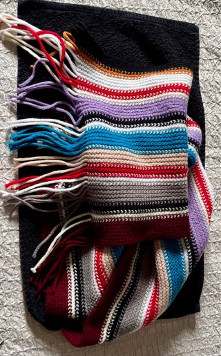 Bufanda tejida con un diseño de rayas multicolor y flecos en los extremos. Es un accesorio llamativo y versátil. - Diseño de rayas vibrantes. - Flecos decorativos en ambos lados. - Tejido suave al tacto. - Sin desperfectos.