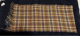 Bufanda de franela con un bonito tejido a cuadros. - Diseño a cuadros en tonos naranja y amarillo. - Acabado con flecos en los extremos. - Material suave y cálido. - Sin desperfectos.
