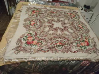 Mantón de Manila cuadrado (128 cms)con un diseño pintado y flecos. - Diseño floral y paisley. - Flecos cortos