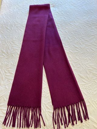 Bufanda de cachemir para señora. Color berenjena. Mide 32 cm de ancho y 175 cm de largo con los flecos -Tacto suave y cálido. -Diseño elegante con flecos en los extremos.