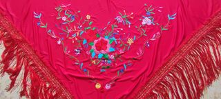 Precioso manton de Manila de seda negra con un bordado de flores rojas y otros colores. Es una pieza única y elegante. Cuadrado y a maquina con flecos. - Seda negra. - Bordado. - Motivos florales. - Flecos de encaje negro.