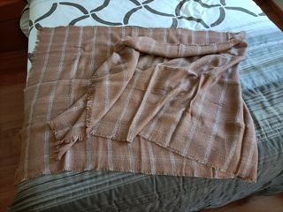 Bufanda grande de color camel con rayas beige. No me acuerdo dónde la compré. Tiene flequitos a los lados. Usada pocas veces. Medidas aproximadas: Ancho: 75 cm Largo: 200 cm