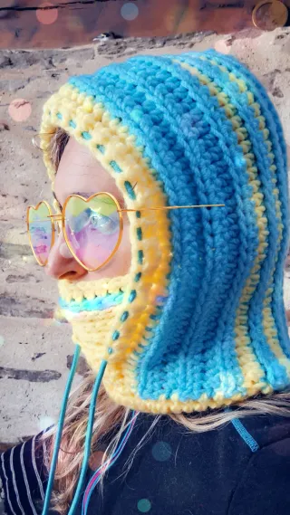 Conjunto de una pieza de capucha y cuello de lana tejido a mano. Ideal para mantenerte abrigado con estilo. - Diseño a rayas en azul y amarillo. - Acabado con cordones para ajustar. - Material suave y cálido.
