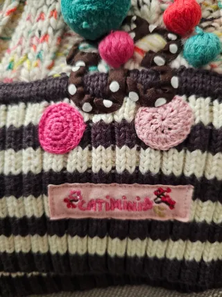 Conjunto de boina y bufanda a juego con un diseño alegre y colorido. La boina tiene un pompón decorativo y la bufanda presenta un detalle de rayas y apliques. - Tejido de punto con múltiples colores. - Boina con adorno de pompones y detalles. - Bufanda con diseño de rayas y apliques.