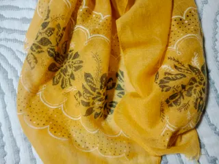 Pañuelo de color mostaza con un delicado estampado floral. - Diseño con flores blancas y detalles en tonos tierra. - Tejido ligero y suave al tacto. - Borde con flecos deshilachados.