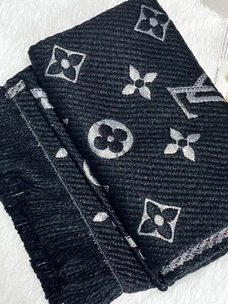 El color negro y plateado tiene un toque elegante y frío, y el monograma con hilo plateado brilla muchísimo bajo la luz. Tejido grueso + flecos, abrigado y con textura premium. Combina perfectamente con abrigos o sudaderas. Viene en caja de regalo, perfecto para regalar o para uso personal.