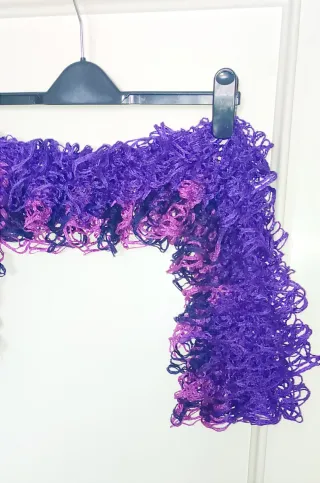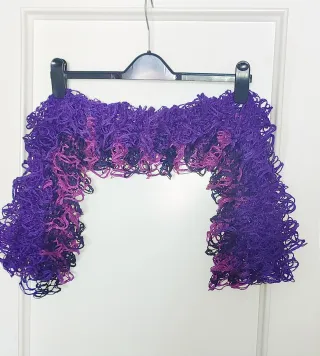 Bufanda de lana con un diseño de fantasía y textura rizada. Es suave y llamativa. - Largo-133; ancho-18. - Hilo de fantasía con rizos. - Combinación de tonos morados y rosas.