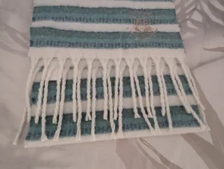 Bufanda con diseño de rayas en tonos azul verdoso y blanco. Presenta un detalle bordado de Harry Potter y flecos en los extremos. Nueva sin usar, con etiqueta. Mide aproximadamente 1,84 cm de largo y 46 cm de ancho, sin contar con los flecos.