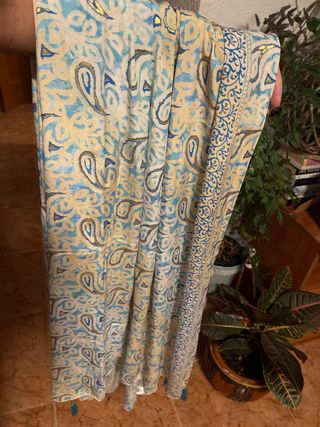 Bufanda con un bonito estampado de estilo paisley. Los colores vibrantes la hacen destacar. - Diseño con motivos paisley. - Combinación de tonos azules y amarillos. - Adornada con pequeños flecos en los extremos.
