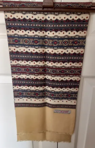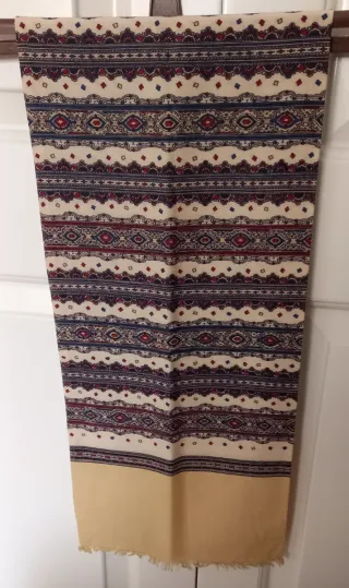 Pañuelo de cuello o bufanda con un diseño de rayas y motivos geométricos en varios colores. El fondo es beige y los detalles son en tonos rojos y azules. Marca: ACETAT Diseño: Rayas y motivos geométricos. Colores: Beige, rojo, azul. Medidas: 106x25cms