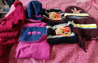 Conjunto de gorro y bufanda para niños. - de lana tejido color granate con pompón. - negro y gris con diseño de coches McQueen. - sombrero azul y rosa con detalles de corazones y bufanda. - marrón con decoración de estrella y líneas azul, amarillo y blanco. Precio x conjunto. hago precio lote.
