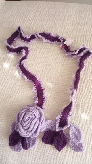Bufanda tejida a mano con un diseño floral. - Detalle de flor grande y hojas. - Borde ondulado. - Hilo de dos tonos de morado.
